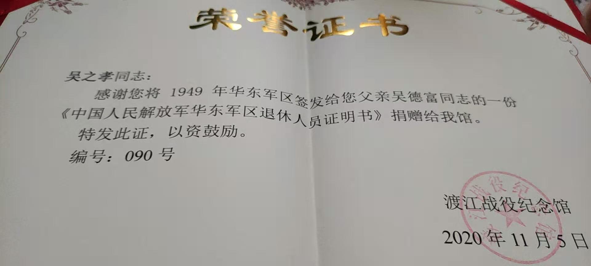 爸爸是1938年2月参加新四军的,为了中华民族的独立和中国人民的解放,跟随陈毅等老一辈无产阶级革命家,不怕流血牺牲,英勇奋战12年,直至新中国成立,才于1949年11月从华东军区7纵19师57团1营上蔚军衔,带着满身疮痍因战残回籍。